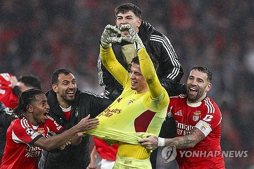 epaselect epa12689431 Benfica's goalkeeper Anatoliy Trubin (C-R) celebrates with his teammates after scoring the 4-2 goal during the UEFA Champions League soccer match between SL Benfica and Real Madrid, in Lisbon, Portugal, 28 January 2026. EPA/MIGUEL A. LOPES