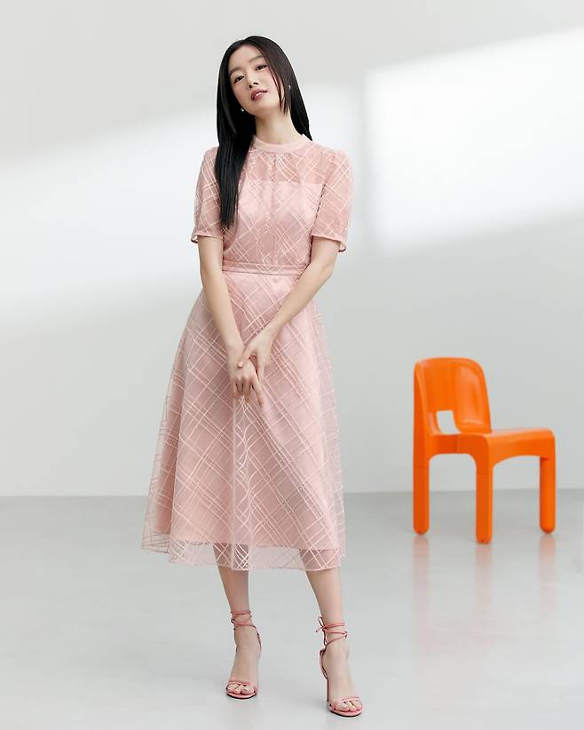세 번째 룩은 파스텔 핑크 체크 패턴의 미디 드레스로, 한선화의 여성스러운 매력을 극대화하고 있다. 반소매 디자인과 A라인 실루엣이 돋보이는 이 드레스는 시스루 소재로 은은한 여성미를 표현했다. 핑크 컬러의 스트랩 샌들로 통일감을 주어 로맨틱한 분위기를 완성했으며, 미니멀한 스타일링으로 드레스 자체의 아름다움을 강조하고 있다.