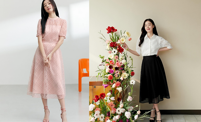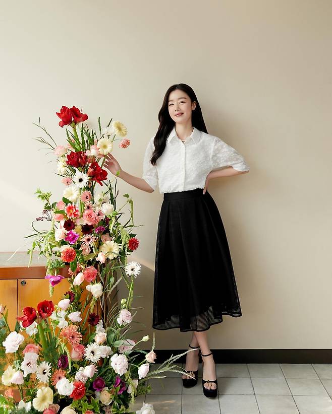 마지막 룩에서 한선화는 텍스처가 돋보이는 화이트 셔츠와 블랙 미디 스커트를 매치했다. 도트 패턴이 은은하게 새겨진 화이트 셔츠는 여성스러움을, 블랙 메쉬 소재의 플레어 스커트는 고급스러움을 더한다. 화려한 꽃 장식 옆에서 포즈를 취한 모습이 봄의 생기를 담아내고 있으며, 블랙 스트랩 힐로 전체적인 룩의 균형을 맞추고 있다.