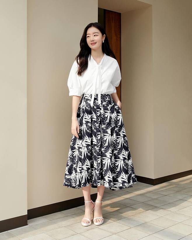 한선화가 선보인 첫 번째 룩은 여성스러움이 돋보이는 화이트 블라우스와 흑백 패턴의 미디 스커트 조합이다. 넉넉한 실루엣의 화이트 블라우스는 리본 디테일로 포인트를 주었으며, 팜 리프 모티프가 돋보이는 흑백 패턴 스커트와 완벽한 균형을 이루고 있다. 화이트 스트랩 샌들로 마무리해 여름철 세련된 오피스룩을 연출하고 있다.