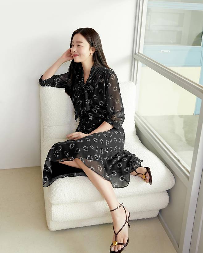 두 번째 룩에서 한선화는 화이트 서클 패턴이 돋보이는 블랙 시스루 원피스를 착용했다. 타이 디테일이 있는 블라우스 형태의 상의와 자연스럽게 이어지는 미디 길이 스커트는 우아함을 더한다. 화이트 의자에 기대어 포즈를 취한 모습에서 편안하면서도 고급스러운 분위기를 자아내고 있으며, 심플한 블랙 스트랩 샌들로 전체적인 세련미를 완성했다.