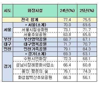 서울의 지난해 3일차 화장률은 69.6%로 전국 평균보다 6%포인트 가까이 낮고, 경기는 2021년(88.1%) 이후 하락세를 지속하며 지난해는 63.1%를 기록했다.
