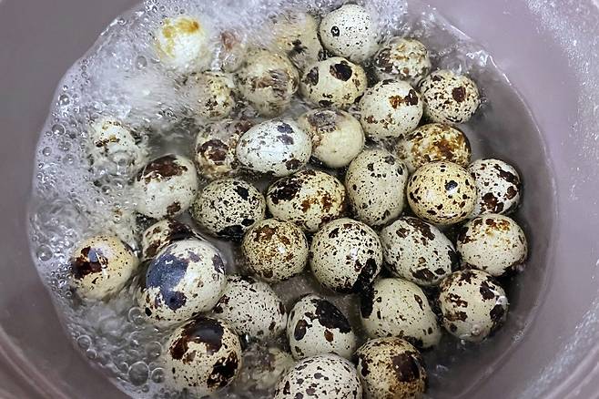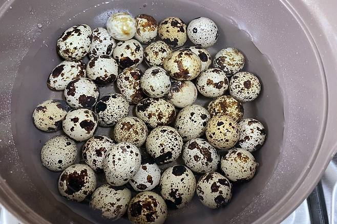 이럴 때 간단한 요령을 알고 계시면 메추리알 껍질 아주 쉽게 깔 수 있어요. 일단 평소 계란 삶듯이 냄비에 물을 채우시고요.