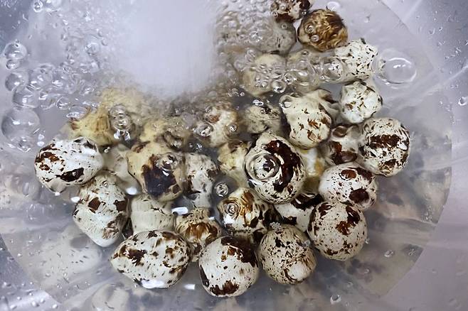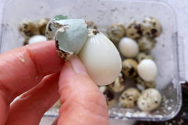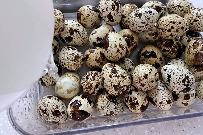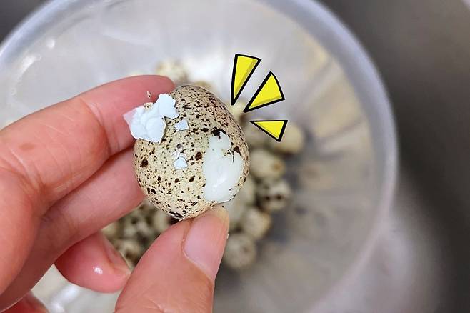 잠시 후 뚜껑을 열어보니 마찰에 의해 껍질이 벗겨진 것도 있는데요. 안 벗겨진 것도 껍질 사이로 물이 들어가게 되어 메추리알이 쉽게 분리될 수 있는 상태랍니다.