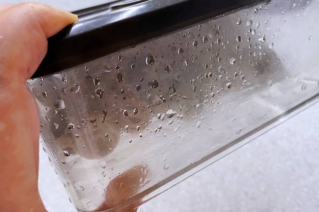 밀폐용기에 메추리알을 넣고 약간의 물을 넣어줍니다.