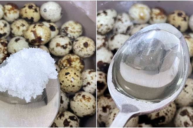 메추리알 터짐 방지를 위해 소금과 식초를 약간 넣어주세요. 계란 삶을 때도 계란을 미리 상온에 꺼내두셨다가 소금, 식초 넣어 삶으면 깨짐을 막아준답니다.