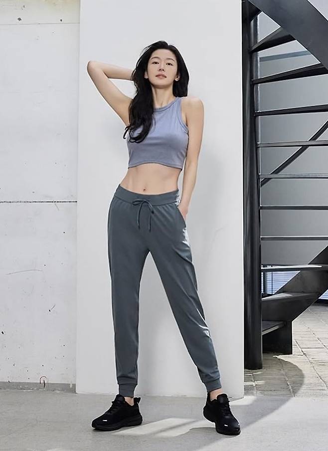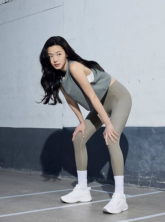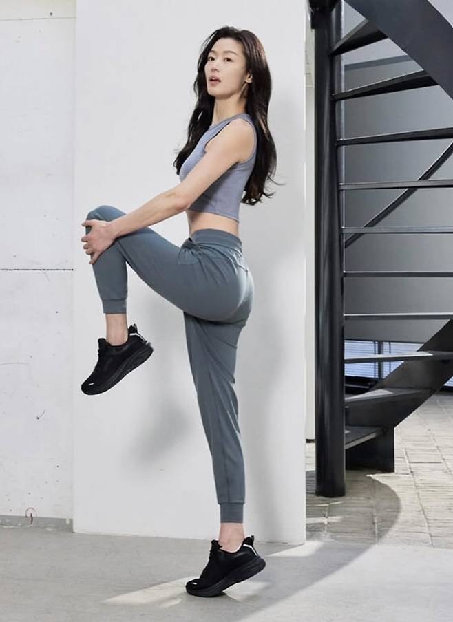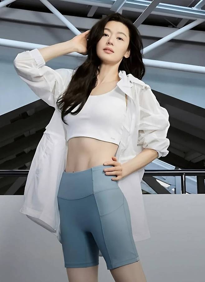 전지현은 최근 애슬레저 브랜드 안다르와 함께한 2025년 S/S 컬렉션 화보에서 그동안 운동으로 다져진 탄탄한 몸매를 드러냈다.
