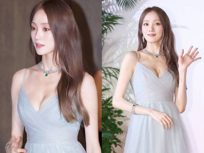 이성경은 은은한 민트빛 시폰 드레스를 착용해 청순하면서도 우아한 분위기를 연출했습니다.