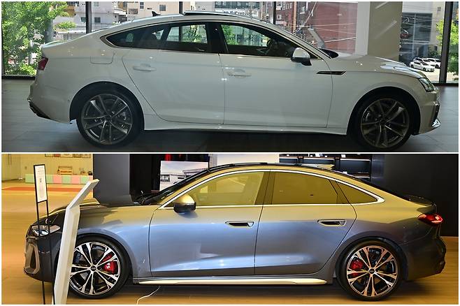 우선 측면부터 살펴보자. 확실히 라인이 달라진 것이 보인다. 구형 A5 대비 전장은 96mm가 늘어났고, 휠베이스는 75mm가 늘어났다. 이로 인해 전체적인 비율이 확 달라진 모습이다. 또한 루프 형상도 달라진 모습인데, 같은 5도어 모델이지만 구형은 쿠페 기반, 신형은 세단 기반이라 차이를 보이고 있는 모습이다.