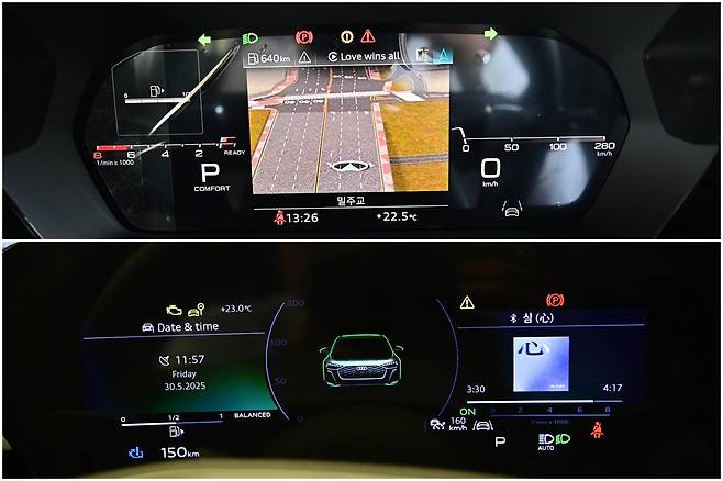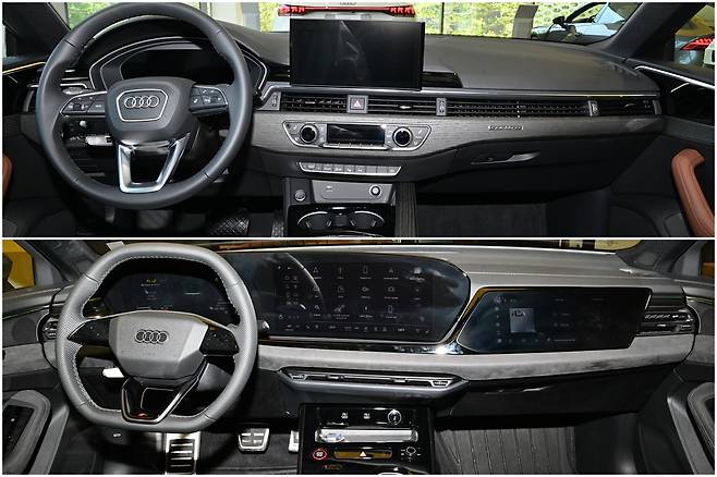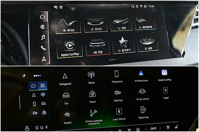마지막으로 디스플레이에서 확인 가능한 인포테인먼트 UI에 대해 살펴보자. 구형 A5는 판매가 완료된 전시차다 보니 전원을 켤 수 없어 공식 사진으로 대체한다. 신형 모델에서는 디스플레이가 커짐과 동시에 이를 잘 활용하기 위해 신규 UI가 적용되었다. 홈에서는 세 가지 종류의 위젯을 보여주며, 메뉴는 태블릿처럼 5X3형태의 바둑판식으로 배치되어 기존 4X2 배열보다 더 많은 항목을 보여준다. 그리고 공조 시스템이 디스플레이 내부에 통합되었다. 조수석 디스플레이는 중앙 디스플레이와 거의 동일한 UI가 적용되어 있다.