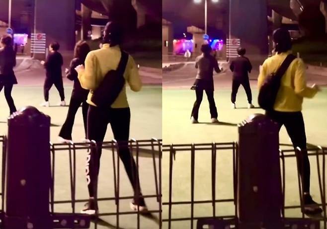 공개된 영상 속 김혜수는 공원에서 에어로빅 중인 시민들을 따라하고 있다. 김혜수의 현란한 발재간이 눈길을 끈다.