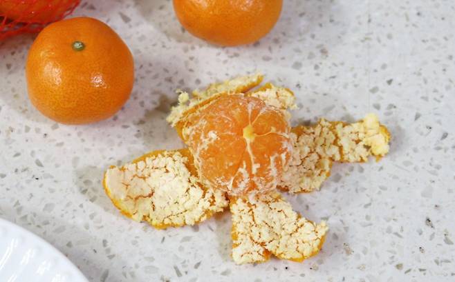 깨끗이 씻은 귤의 껍질을 까되, 하얀 속껍질은 최대한 남겨두세요.