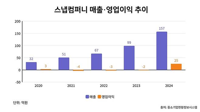 회사는 주력 사업 실적을 바탕으로 외형을 꾸준히 키우고 있다. 스냅컴퍼니의 2024년 매출은 157억원으로 전년 대비 58.6% 증가했다. 영업이익은 25억원으로 2억원 손실을 기록한 2023년에서 흑자전환에 성공했다. 2024년 말 기준 자본총계 51억원, 부채총계 28억원으로 부채비율 55%를 기록해 부채 부담도 크지 않은 편이다.
