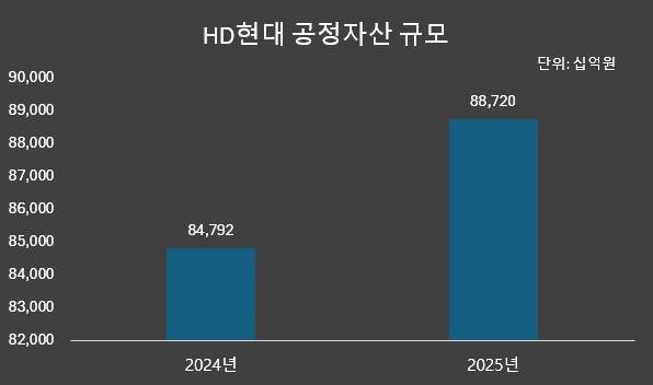2025년 발표 기준 HD현대 공정 자산 규모는 88조7200억원으로 전년 84조7920억원 대비 약 4조원 증가했다. 대규모 수주 낭보를 전한 조선 계열사가 그룹의 성장을 이끌었다. HD현대중공업, HD현대삼호, HD현대미포 등이 속한 HD한국조선해양의 지난해 연결 기준 자산 규모는 1년 전 보다 4조4800억원 늘어난 36조7191억원으로 집계됐다. 선박 수주에 따른 계약부채(12조7159억원), 확정계약자산(1조1923억원) 등이 늘어난 영향이다.