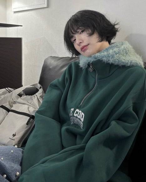 포근한 하프 집업 맨투맨에 털이 살짝 올라온 넥라인이 따뜻한 무드를 더하고, 진주 장식이 콕콕 박힌 와이드 데님 팬츠와의 조합이 감각적인 스트릿 룩을 완성했어요.