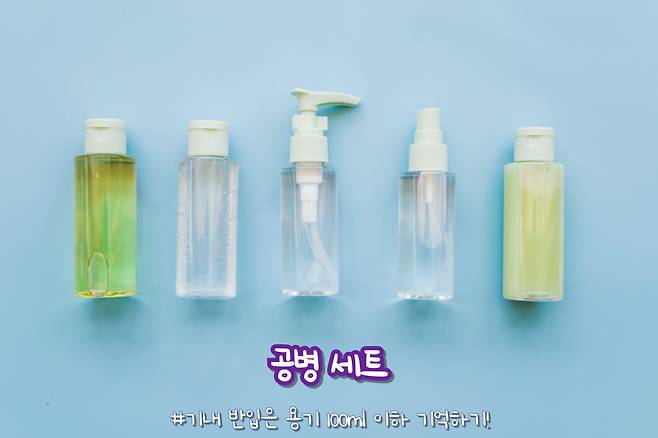 기내 반입 가능한 공병 크기는 최대 100ml로, 모든 액체를 합쳐 1L를 넘지 않아야 합니다. 다이소 공병(100ml 이하 제품)을 활용하면 기초 화장품 및 세안 도구를 깔끔하게 사용할 수 있습니다.