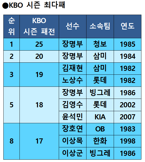 뒤를 이어 18패 그룹에 1986년의 장명부(빙그레), 2002년의 김영수(롯데), 2007년의 윤석민(KIA)이 있다. 세 팀은 해당 시즌에 암흑기였다는 공통점이 있다. 특히 1986년은 빙그레 이글스가 창단한 뒤 1군 리그에 진입한 첫해였다.