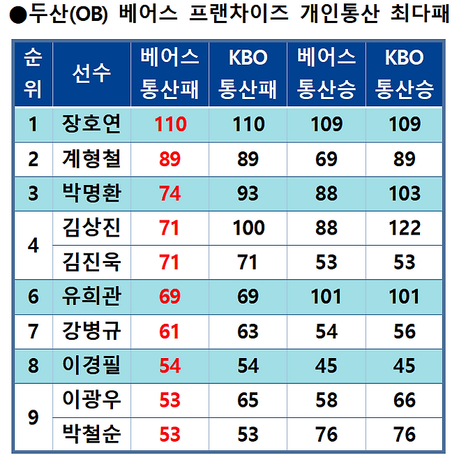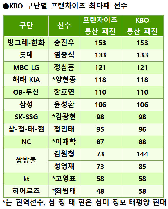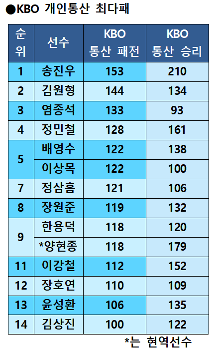 한편 역사 속으로 사라진 현대 유니콘스(삼미-청보-태평양 포함)는 정민태가 95패, 쌍방울 레이더스는 김원형과 성영재가 73패를 기록해 공동 최다패 투수로 이름을 남겼다.