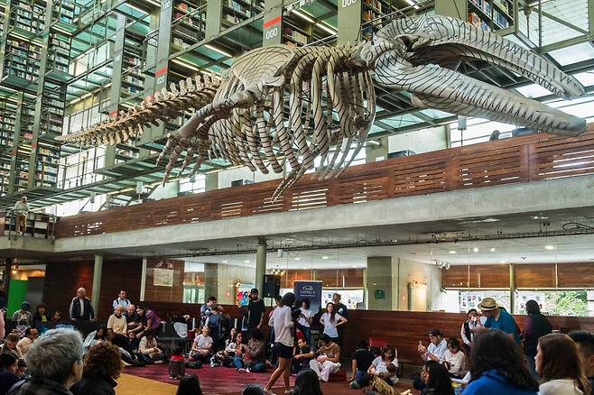 바스콘셀로스 도서관의 중앙에는 거대한 크기의 공룡 모형이 전시되어 있습니다.