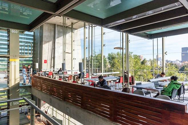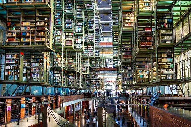 마치 공중에 떠 있는 듯한 인테리어와 공간을 압도하는 엄청난 규모의 서가가 특징입니다.