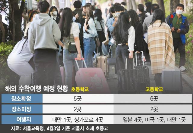 4일 서울경제신문 취재 결과 서울 시내 1300여 개 초중고 가운데 올해 해외 수학여행 계획을 확정한 학교는 총 15곳으로 파악됐다. 이 중 초등학교 5곳, 고등학교 6곳은 해외 여행지를 선정했고 나머지 4곳은 아직 장소를 정하지 못했다. 일본과 싱가포르(각각 4곳)가 가장 많은 선택을 받았고 대만(2곳), 미국(1곳)이 뒤를 이었다.