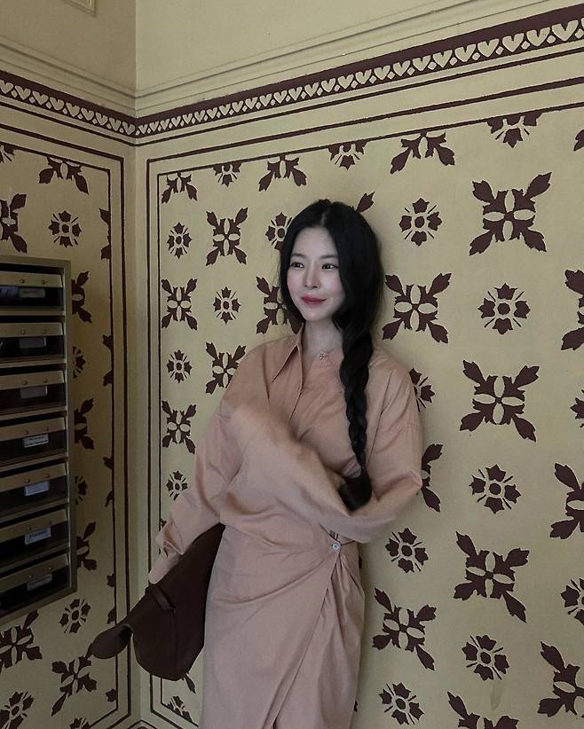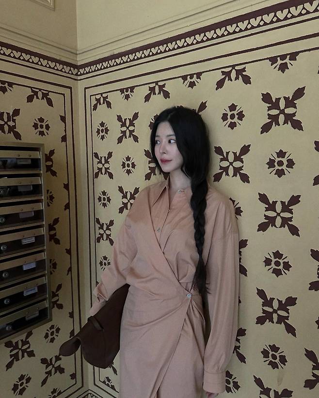 몸의 실루엣이 드러나지 않는 베이지 톤 셔츠 드레스는 여유로운 핏이지만 오히려 절제된 아름다움을 강조해요. 랩 스타일로 한쪽에 자연스레 잡힌 셔링이 허리를 조여주면서 실루엣에 은근한 리듬을 만들고요.
