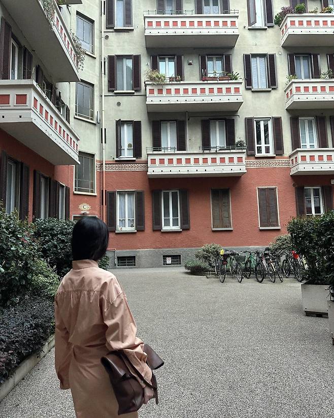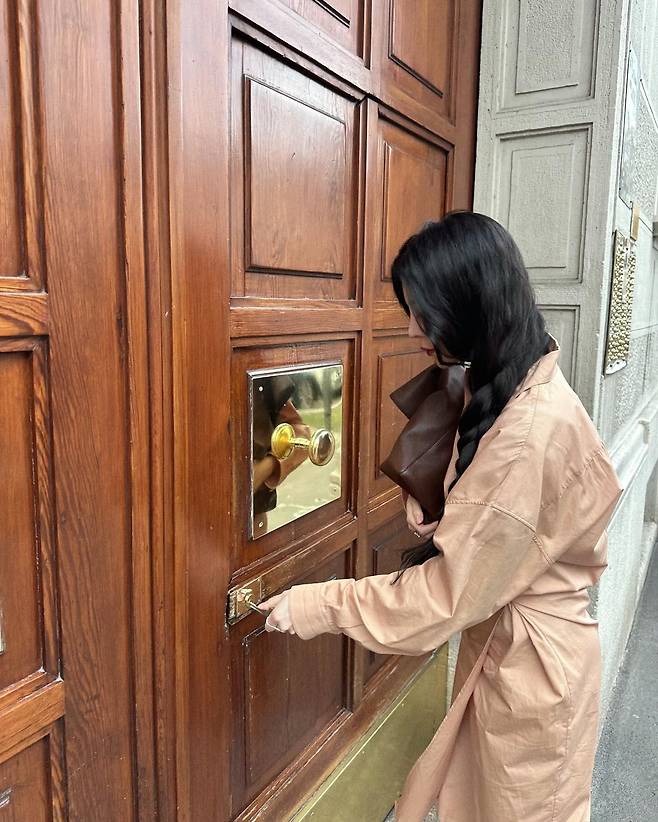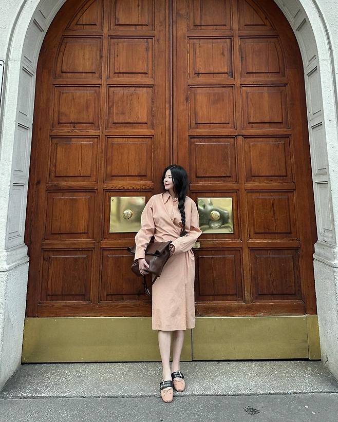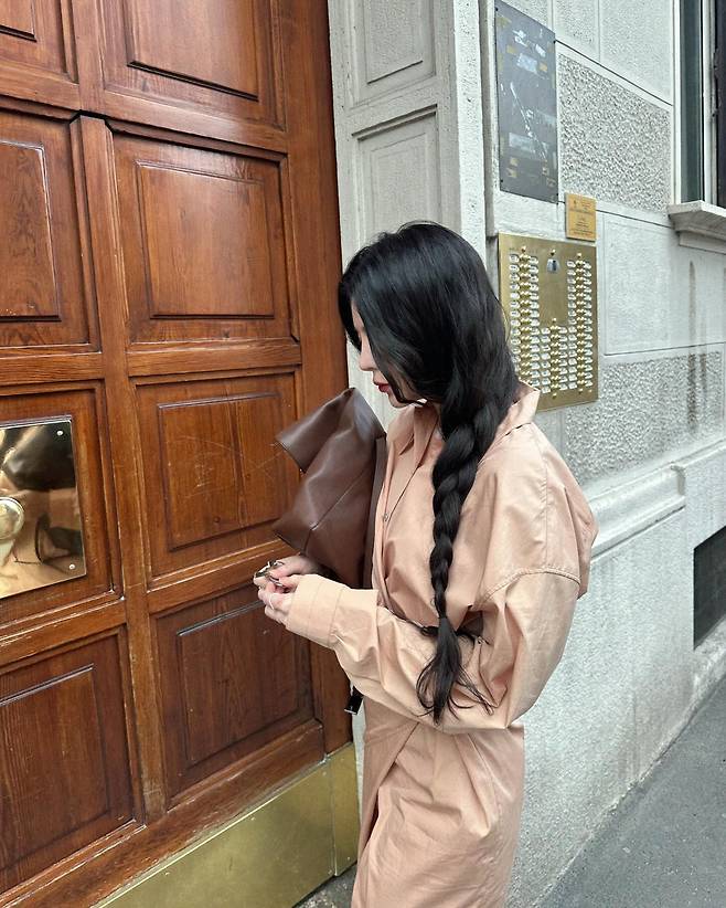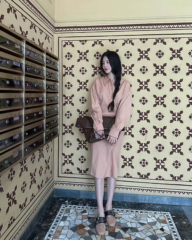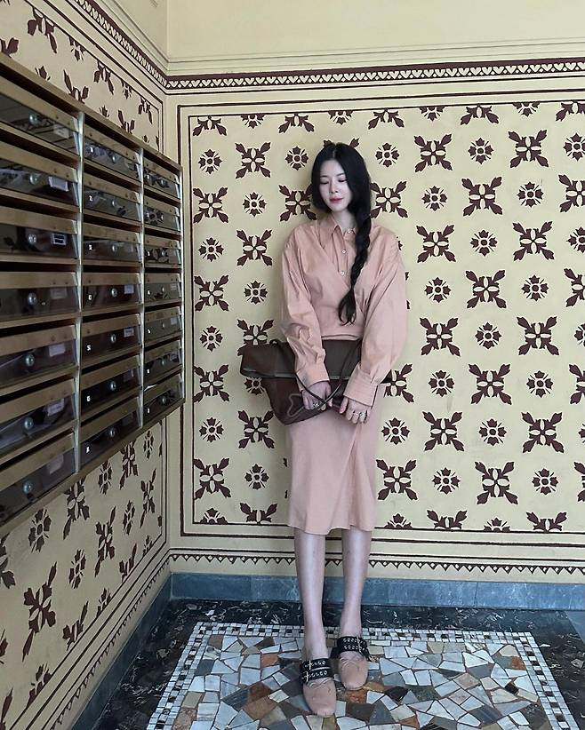 버클 디테일의 뮬 슈즈와 크고 무게감 있는 브라운 클러치백을 더해 밸런스를 맞춘 스타일이에요. 어떤 포인트도 과하지 않고, 전체적으로 차분하고 부드럽지만 오히려 강한 여백의 미가 느껴지죠.