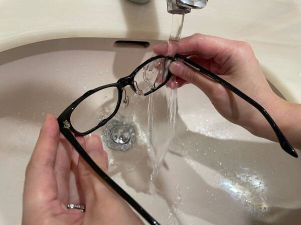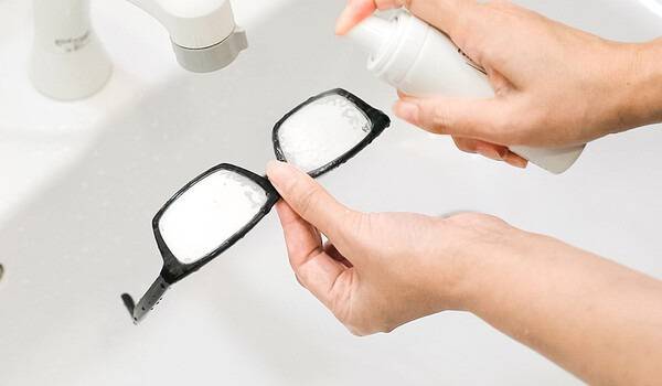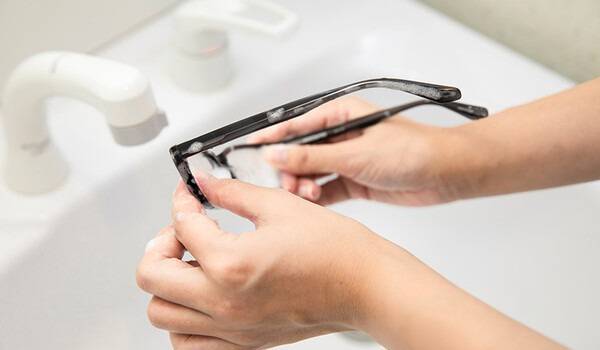 손끝으로 부드럽게 문질러 세척 - 스펀지나 수세미는 금지, 손가락 끝으로 렌즈와 테 부분을 가볍게 마사지하듯 닦습니다.