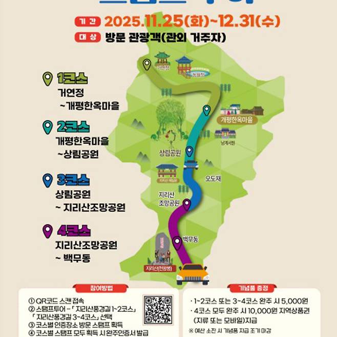 총 연장 59.5km에 이르는 이 길은 지리산과 덕유산의 웅장함, 그리고 함양의 역사와 문화를 따라 조성되어 있습니다. 11월 25일부터 12월 31일까지 진행되는 이번 스탬프 투어는 도로를 걷고, 풍경을 관찰하며, 기록으로 남기는 체험형 관광 프로그램입니다.