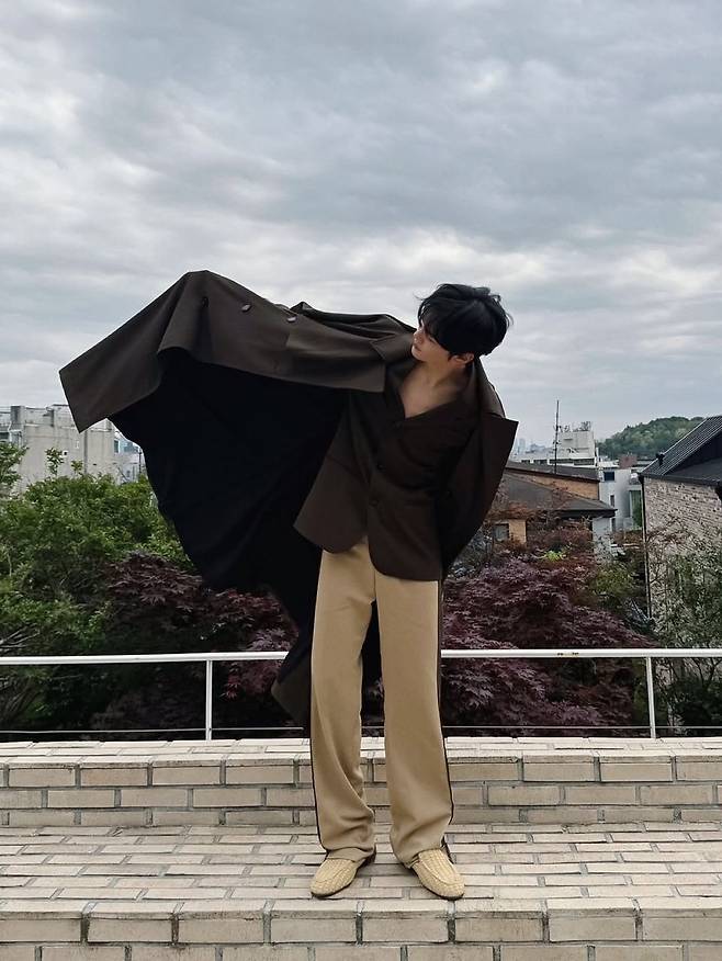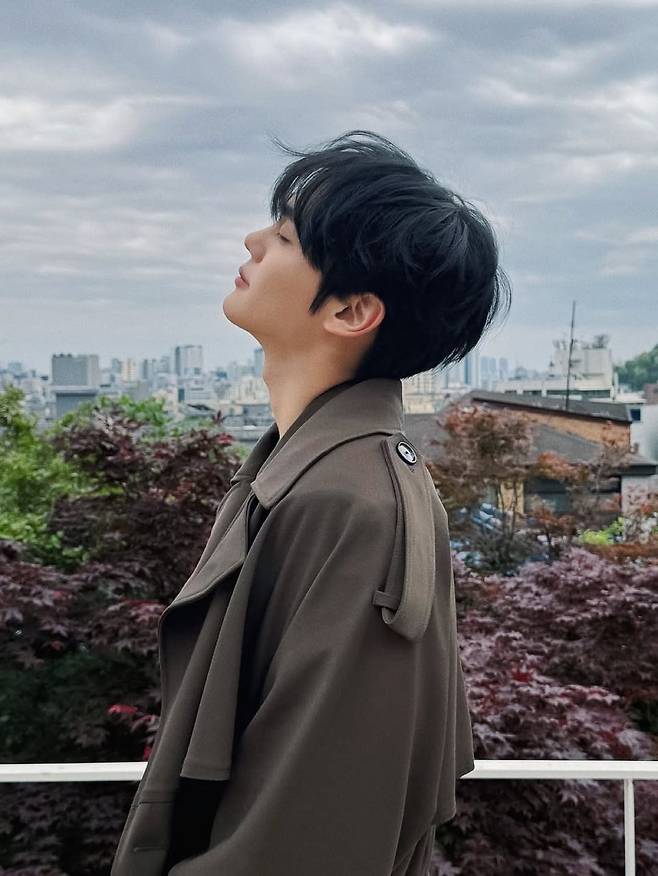 이번 착장에서 가장 눈에 띄는 아이템은 단연 트렌치코트다. 둔탁한 어깨 견장 디테일과 넉넉한 소매 너비가 남성적인 실루엣을 강조하며, 군더더기 없는 직선 라인은 전체적인 스타일을 정돈된 느낌으로 마무리한다. 은은한 카키톤은 계절의 흐름과 자연스럽게 어우러지며, 그의 흑발과도 완벽하게 조화를 이룬다. 시선을 살짝 아래로 떨군 포즈는 마치 화보 속 한 장면처럼 몽환적인 분위기를 극대화한다.