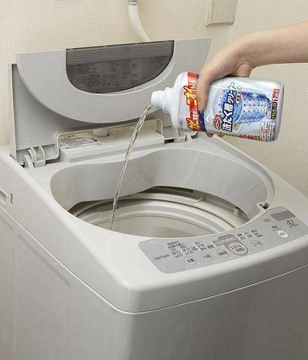 세탁기 안에 식초 한 컵과 베이킹소다 3스푼을 넣고