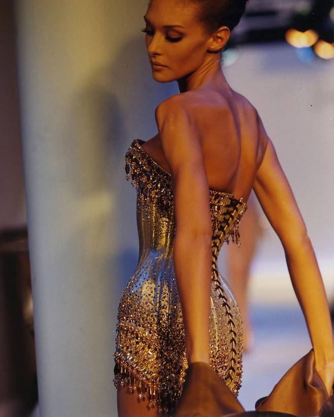 젠 데이아, 카일리 제너 등 최근 레드카펫 위에서 뮈글러의 빈티지 드레스를 입은 유명 인사들를 쉽게 볼 수 있다. 이 흐름을 따르는 듯 마고 로비(Margot Robbie) 또한 이번 파티 룩으로 뮈글러의 1996 봄-여름 컬렉션 속 골드 코르셋 뷔스티에 드레스와 골드 가운을 골랐다. 화려한 드레스인만큼 헤어스타일과 메이크업, 주얼리 등을 최소화해 센스 있는 스타일링을 보여주었다.