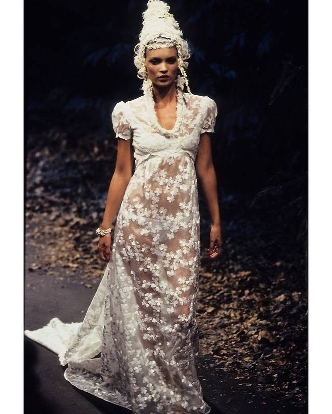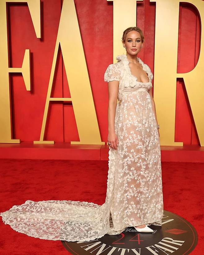 넷플릭스 드라마 <브리저튼>을 연상케 하는 룩이 레드카펫 위에 등장했다. 주인공은 제니퍼 로렌스(Jennifer Lawrence). 그녀가 착용한 엠파이어 실루엣 드레스는 지방시의 1996년 가을-겨울 오트 쿠튀르 컬렉션 피스로 속이 비치는 화이트 실크 오간자 소재와 잔잔한 플라워 패턴이 인상적이다. 존 갈리아노가 수석 디자이너로 선보인 컬렉션이기에 지금과는 또 다른 지방시의 감성을 느낄 수 있다.