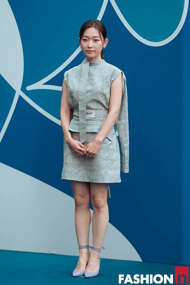 배우 김슬기가 낙서와 같은 느낌의 아트워크 프린트가 돋보이는 실험적인 패턴의 민소매 윈피스룩으로 패션위크 스타일을 선보였다.