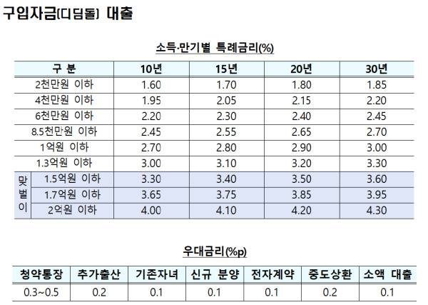 구입자금 대출은 소득과 만기에 따라 3.30~4.30%, 전세자금 대출은 소득과 보증금 수준에 따라 3.05~4.10%의 기본 금리로 제공된다.