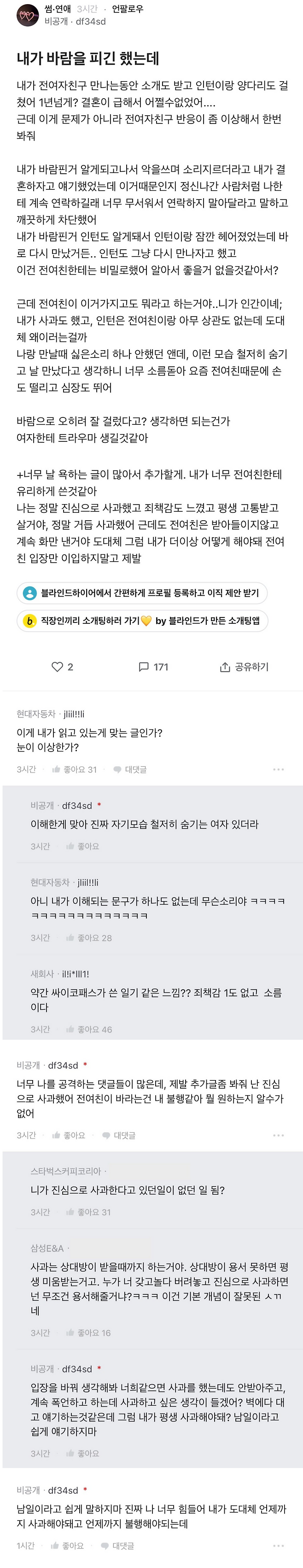 본인이 바람을 피긴 했는데 전 여친 반응이 이상하다는 남자