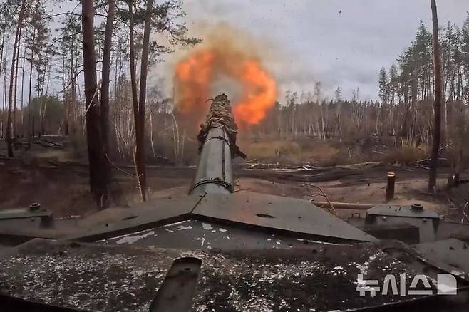 [우크라이나=AP/뉴시스] 러시아 국방부가 제공한 사진에 22일(현지시각) 러시아 T90M 프로리프 전차가 장소가 알려지지 않은 곳에서 우크라이나 진지 방향으로 발포하고 있다. 2024.11.22.
