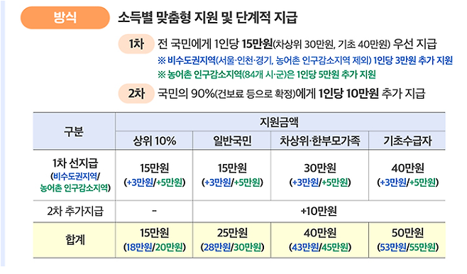 이번 소비쿠폰은 소득 기준에 따라 차등 지급됩니다. 기초생활수급자는 1인당 40만 원, 차상위 계층 및 한부모 가족은 30만 원, 일반 국민 중 소득 하위 90%는 25만 원을 받을 수 있습니다. 여기에 비수도권 및 농어촌 인구감소지역 거주자는 추가 지원까지 받을 수 있어, 최대 수령 금액은 55만 원에 이릅니다.