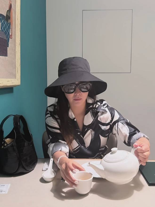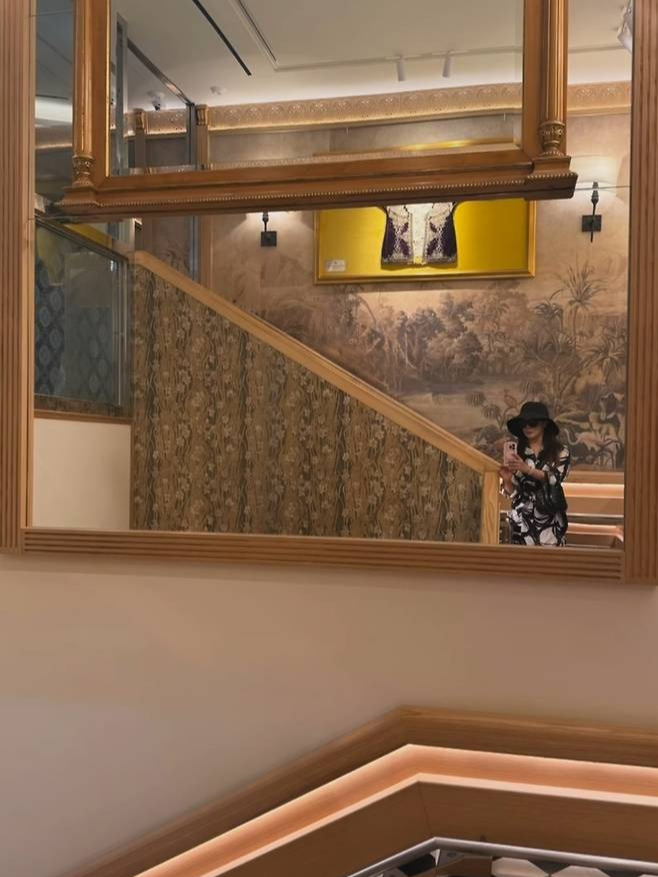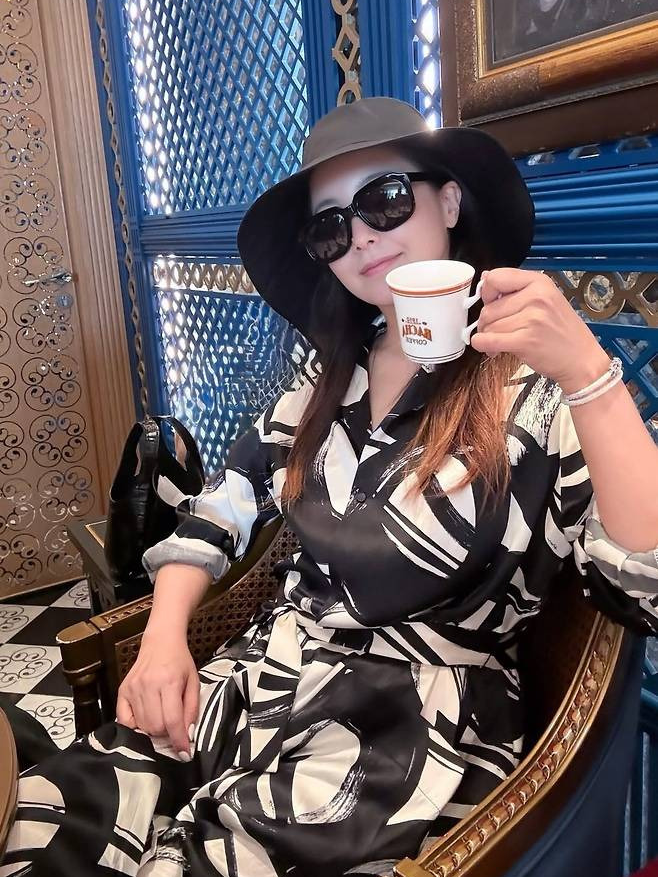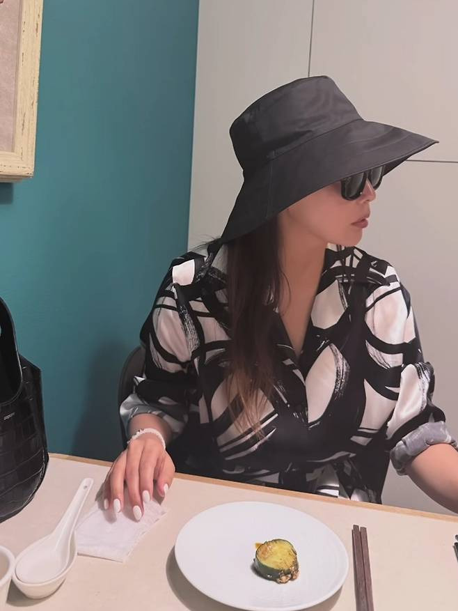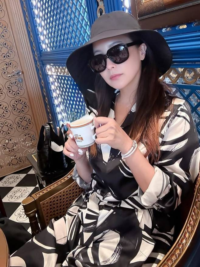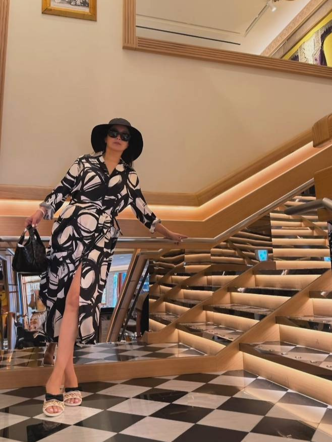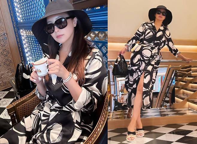 여기에 차콜 톤 와이드 햇과 블랙 선글라스를 더해 럭셔리 휴양지 느낌을 연출했고, 볼드한 귀걸이와 브레이슬릿으로 마무리한 스타일은 “역시 김희선”이라는 말이 절로 나올 정도로 완성도가 높았습니다.