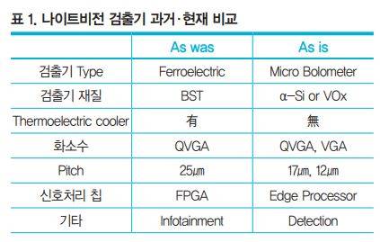최근 차량용 나이트비전시스템에 탑재되는 적외선 검출기는 MEMS 기술로 만들어진 열형 타입(Thermal Detector)의 비냉각형 마이크로 볼로미터(Uncooled Micro bolometer) 검출기이다. 하지만 최초의 차량용 나이트비전에 사용된 검출기는 BST(Barium Strontium Titanate) 재질의 Ferroelectric 검출기를 적용한 제품이다. Raytheon에서 만든 이 제품은 2000년 GM Cadillac Deville 차량에 적용이 되어 출시 되었다. 이후 BST 검출기의 큰 단점인 주기적인 Chopper 구동으로 인한 잦은 고장 위험성으로 볼로미터(α-Si or VOx) 타입 검출기가 장착된 제품으로 완전히 바뀌었다.