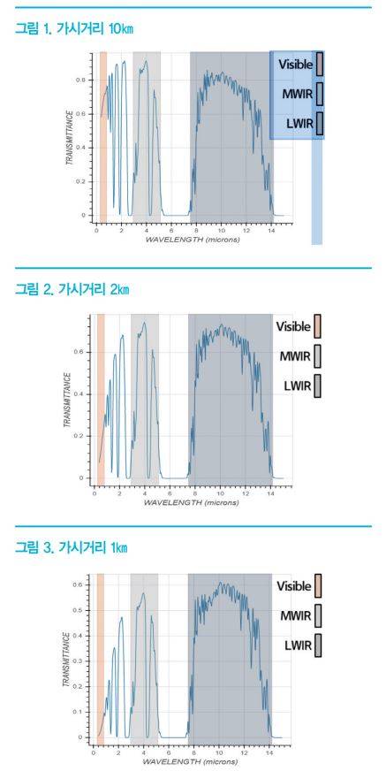 차량의 자율 주행은 다음과 같이 ① Sensing, ② Fusion, ③ Localization, ④ Path Finder, ⑤ Control 5 단계로 구분할 수 있으며, 자율주행 기술이 고도화 되기 위해서는 언급한 모든 단계의 리던던시(Redundancy) 확보가 매우 중요하다. 그 중 첫번째 단계인 센싱 단계에서의 리던던시 확보 중요성은 굳이 언급할 필요가 없을 정도로 중요하며, 차량 ODD 확장의 첫 출발점이다. 그 이유는 센서들의 센싱능력은 이상적인 날씨 뿐만 아니라 악천후 날씨에서도 주변 인지를 지속적으로 해야하기 때문이다. 나이트비전 시스템은 미세먼지, 안개, 눈, 비 등 다양한 악천후 상황에서도 주변환경을 잘 인식하고, 물체를 인지할 수 있는 센서이다. 이것은 나이트 비전이 장파장 적외선 대역의 에너지를 사용하기 때문인데 <그림 1>, <그림 2>, <그림 3>의 각각 가시거리 별 MODTRAN 시뮬레이션결과를 보면 그 이유를 직관적으로 알 수 있다. 시뮬레이션 조건은 중위도 지역, 여름, Slant Path 1㎞이다. 가시거리가 10㎞ 조건에서는 가시광선(Visible), 중적외선(MWIR), 원적외선(LWIR) 대역 등 14㎛ 이하 모든 전자기파 파장 대역 대부분의 에너지 대기투과율이 높다는 것을 알 수 있다. 하지만 가시거리가 2㎞ 이하부터는 가시광선 대역 뿐 아니라 약 1~2㎛ 사이를 주로 사용하는 레이저 파장대역에서도 에너지 투과가 급격히 저하되는 사실을 알 수 있다. 물론 제한된 가시거리 환경에서 단지 에너지 투과율만으로 탐지/인지 거리가 결정되지는 않는다. 하지만 원적외선 대역 에너지가 악천후 날씨에도 먼 거리까지 도달한다는 것은 사실이며 이러한 이유로 나이트비전이 그러한 환경에서