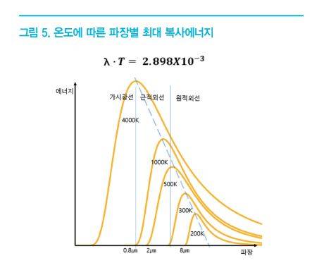 의 온도에 상응하는 복사에너지를 지속적으로 방출하고 있다는 점을 상기해보자. 이것은 주변 대비 상당히 높은 에너지라 할 수 있으며 물체와 그 주변의 온도 차이를 인식하는 나이트비전이 먼 거리에서도 쉽게 생물체를 인지하고 사고를 예방할 수 있는 주된 근거가 된다. 특히 나이트비전시스템에 일반적으로 장착되는 적외선 검출기의 등가잡음온도차(NETD, Noise Equivalent Temperature Difference)가 평균적으로 50mK(0.05℃) 이하 임을 감안하면 야간 뿐 아니라 시야 확보가 매우 어려운 심한 악천 후 상황에서도 보행자 및 동물 탐지가 매우 탁월하다는 사실을 확인할 수 있다. 게다가 빈의 변위 법칙에 의해 물체의 온도에 따라 최대 방사되는 복사 에너지 파장이 결정되는데 230~350K 내외의 우리가 생활하는 공간에 있는 물체 복사 에너지 최대 방출 영역은 원적외선 파장 대역인 8~14㎛라는 점이다<그림 5>.
