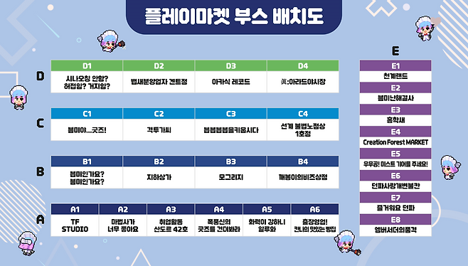 레바, 낡은창고, 족제비와 토끼, 쭐어, SSS, Yuu 등 인기 일러스트 작가들이 참여하는 플레이마켓이 이번 던파 페스티벌에서 열린다. 플레이마켓은 던파 관련 2차 창작물, 코스프레, 공연 등이 핵심이 되는 던파 동인 행사다.