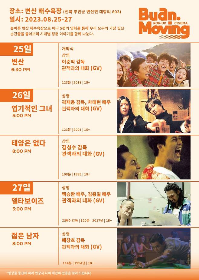 '팝업 시네마:부안 무빙'은 26일과 27일에도 계속된다. 26일에는 두 편의 영화가 관객을 만난다. 이날 오후 5시에는 거침없는 여대생과 평범한 복학생의 사랑을 그린 '엽기적인 그녀' 상영과 주연 차태현과 곽재용 감독이 참석한 관객과의 대화가 열린다. 오후 8시에는 방황하는 청춘들의 욕망과 좌절, 희망을 그린 이정재‧정우성 주연의 '태양은 없다'가 상영한다. 상영 뒤에는 연출자인 김성수 감독의 관객과의 대화가 진행된다.