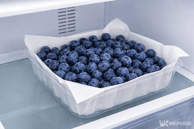 씻은 블루베리는 바로 용기에 넣지 말고 먼저 넓게 펼쳐 놓는 것이 좋다. 키친타월이나 깨끗한 면 행주 위에 한 층으로 펼치면 공기와 닿는 면적이 넓어져 물기가 더 빨리 마른다.