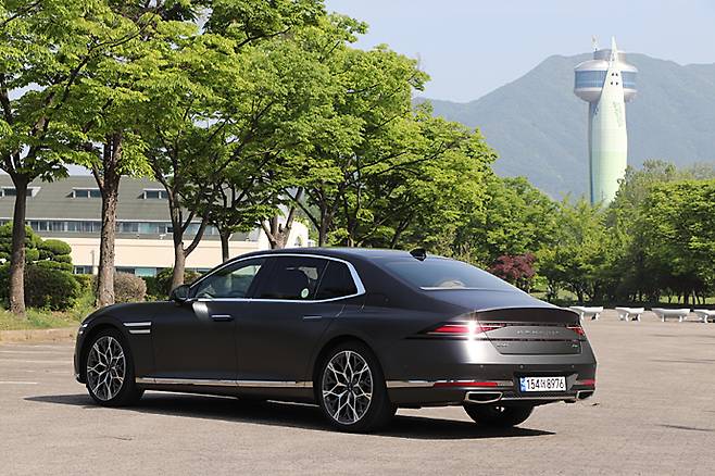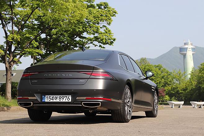 뒤쪽에서는 G80와 유사한 날카로운 트렁크 리드가 여전히 강하게 다가온다. 야간에는 두 줄이 강한 존재감을 내뿜는 것은 브랜드 내 다른 모델들과 마찬가지이다.