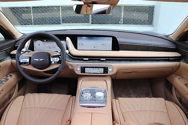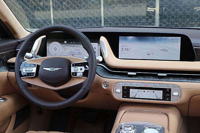 스티어링 휠은 GV80에서와 같은 2스포크형인데 패드 위아래로 컬러풀한 트림을 삽입해 H 타입으로 보인다. 좌우의 리모컨 버튼도 위아래로 펼쳐져 있는 G80과는 달리 모아져 있다. 사용자의 피드백을 반영한 것으로 보인다. 그 안으로 보이는 계기판에 표시되는 내용이 다시 한번 진화했다. 증강현실이 적용된 내비게이션은 물론이고 3일 동안의 일기예보창까지 뜬다. 숫자로 표시되는 속도계와 엔진회전계도 어색하지 않다. 물론 클래식 타입의 원형 클러스터도 표시할 수 있다.