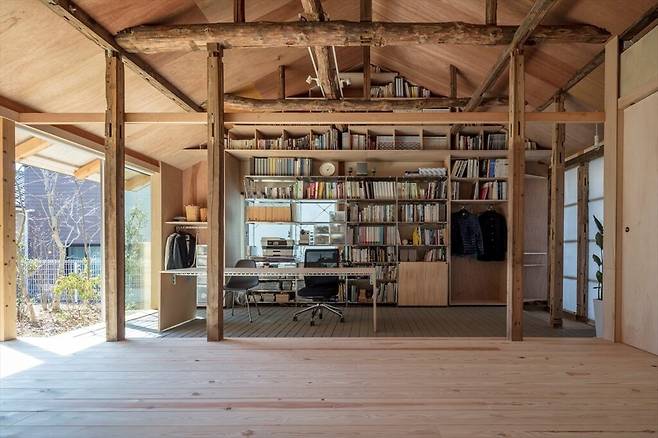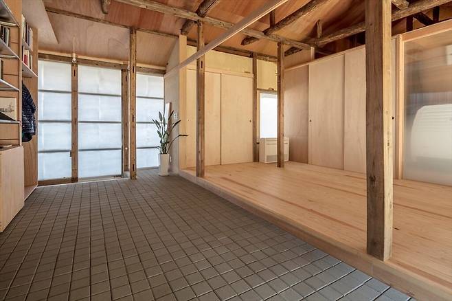 거실은 높은 천장을 이용한 박공 지붕 구조로 설계되어 개방감이 뛰어납니다. 이 공간은 로프트로 자연스럽게 이어지며 가족이 함께할 수 있는 공간으로 확장됩니다. 철거된 천장 뒤로 드러난 오래된 보와 기둥은 집의 역사를 고스란히 담고 있으며, 라왕 합판의 뒷면을 드러낸 마감은 따뜻한 느낌을 줍니다.