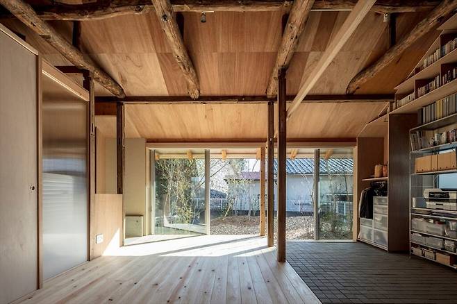 이 집의 또 다른 독특한 점은 '토간'이라 불리는 별도의 흙간입니다. 바닥에 단열재가 깔려 있어 한기를 막아주며, 벽 전체를 따라 설치된 선반은 충분한 수납 공간을 제공합니다.