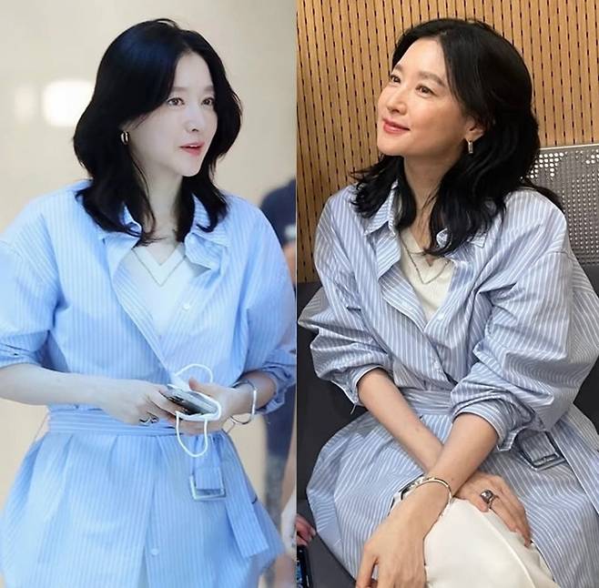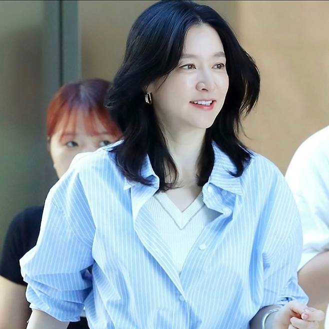 배우 이영애가 우아한 미소와 함께 스트라이프 셔츠 벨티드 원피스룩으로 출근길을 밝혔다.